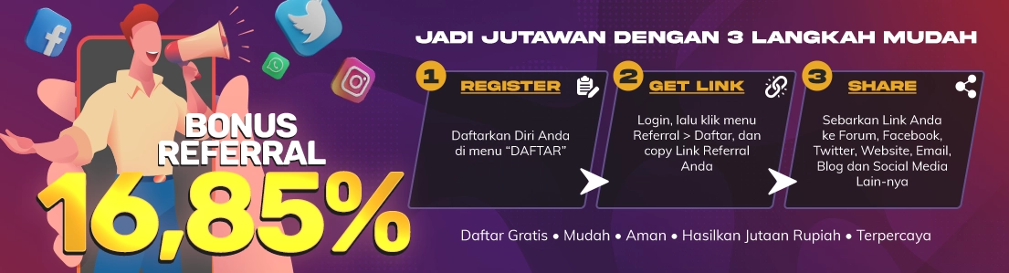 Referral system tidak dipungut biaya apapun. Hanya dengan modal online saja setelah itu Anda hanya tinggal mengecek keuntungan Anda yang dapat dilihatsecara online kapanpun dan dimanapun. Register sekarang juga dan referensikan Link referral Anda.